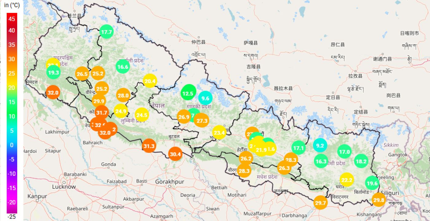 काठमाडौंमा २५.४ डिग्री सेल्सियस, नेपालगन्जमा ३२