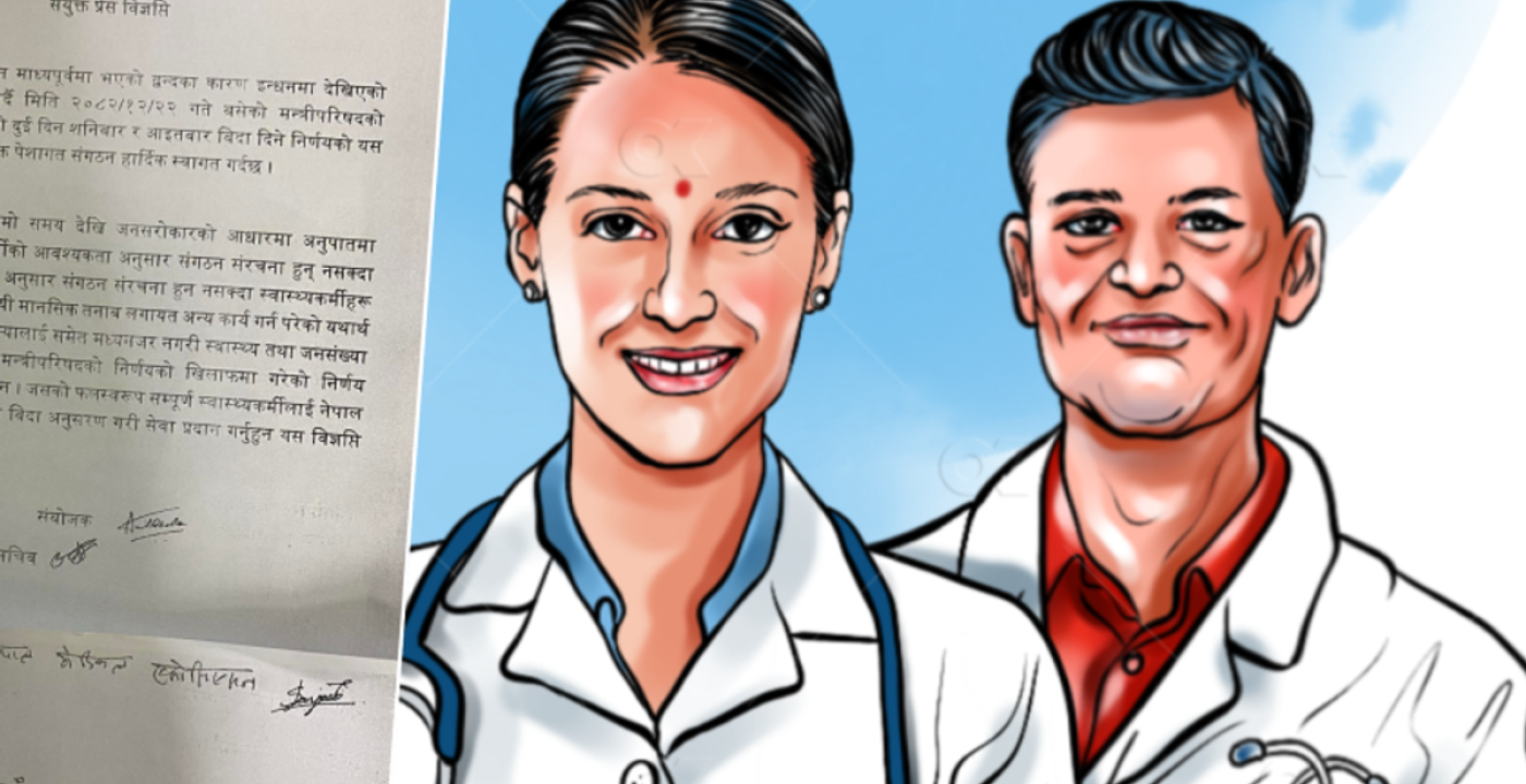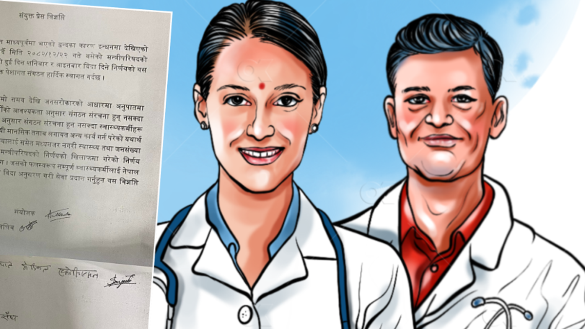 ‘लामो समयदेखि स्वास्थ्य क्षेत्रमा आवश्यक जनशक्तिको अभाव र संगठन संरचनाको कमजोरीका कारण चिकित्सक तथा स्वास्थ्यकर्मीहरू अत्यधिक कार्यबोझमा परिरहेका छन्। त्यसबाट मानसिक तनावसहित विभिन्न समस्या उत्पन्न भइरहेको छ,’ विज्ञप्तिमा भनिएको छ। संगठनहरूले स्वास्थ्य तथा जनसंख्या मन्त्रालयले मन्त्रिपरिषद्को निर्णय विपरीत स्वास्थ्य क्षेत्रमा दुई दिन बिदा लागु नगर्ने निर्णय गरेको भन्दै त्यसलाई कानुनी रूपमा कार्यान्वयनयोग्य नभएको दाबी गरेका छन्। मन्त्रालयले उक्त निर्णय तत्काल सच्याउनुपर्ने उनीहरूको माग छ।