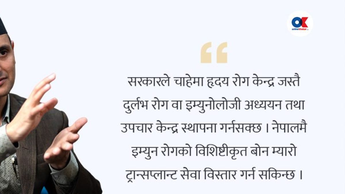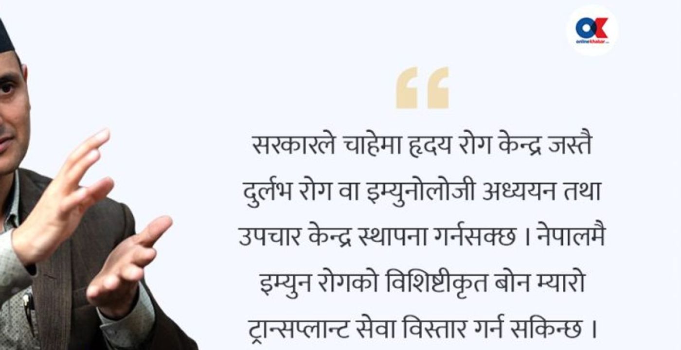 सरकारले इम्युनोलोजी सेवा विस्तारका लागि के कदम चाल्नुपर्छ? सरकारले हृदय रोग केन्द्रजस्तै दुर्लभ रोग तथा इम्युनोलोजी अध्ययन र उपचार केन्द्र स्थापना गर्न सक्छ। नेपालमै बोन म्यारो ट्रान्सप्लान्ट सेवा विस्तार गर्न सकिन्छ। तर एउटा व्यक्तिले मात्र सम्भव छैन, मेडिकल शिक्षण संस्थाले इम्युनोलोजी संकाय अपनाउनुपर्छ र शिक्षण सुरु गर्नुपर्छ।