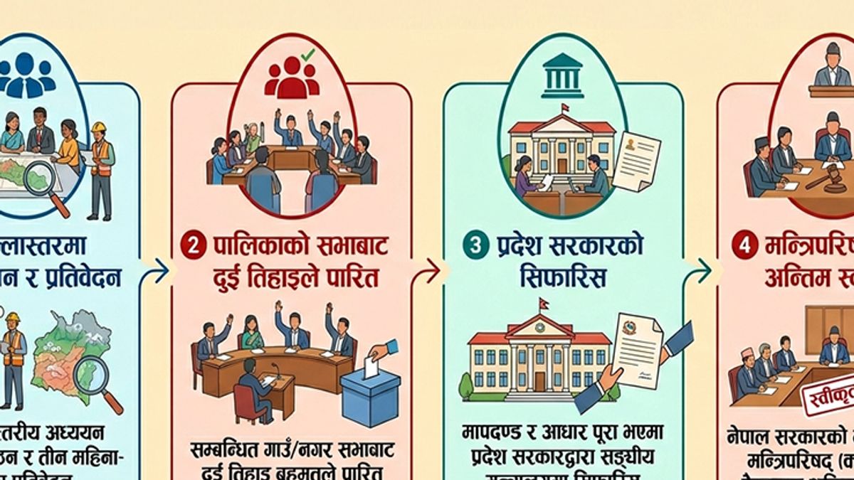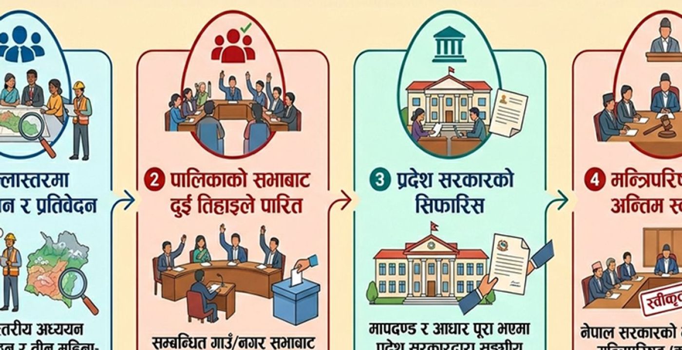 ३. प्रदेश सरकारको सिफारिस – स्थानीय तहबाट दुई तिहाइले पारित भएको प्रस्ताव प्रदेश सरकारले अध्ययन गर्नेछ। यदि प्रस्तावमा तोकिएका मापदण्ड र आधारहरू पूरा भएको देखिएमा, प्रदेश सरकारले निर्णय सहित संघीय मामिला मन्त्रालयमार्फत केन्द्र सरकार (नेपाल सरकार) लाई सिफारिस गर्नेछ।