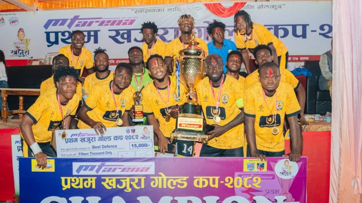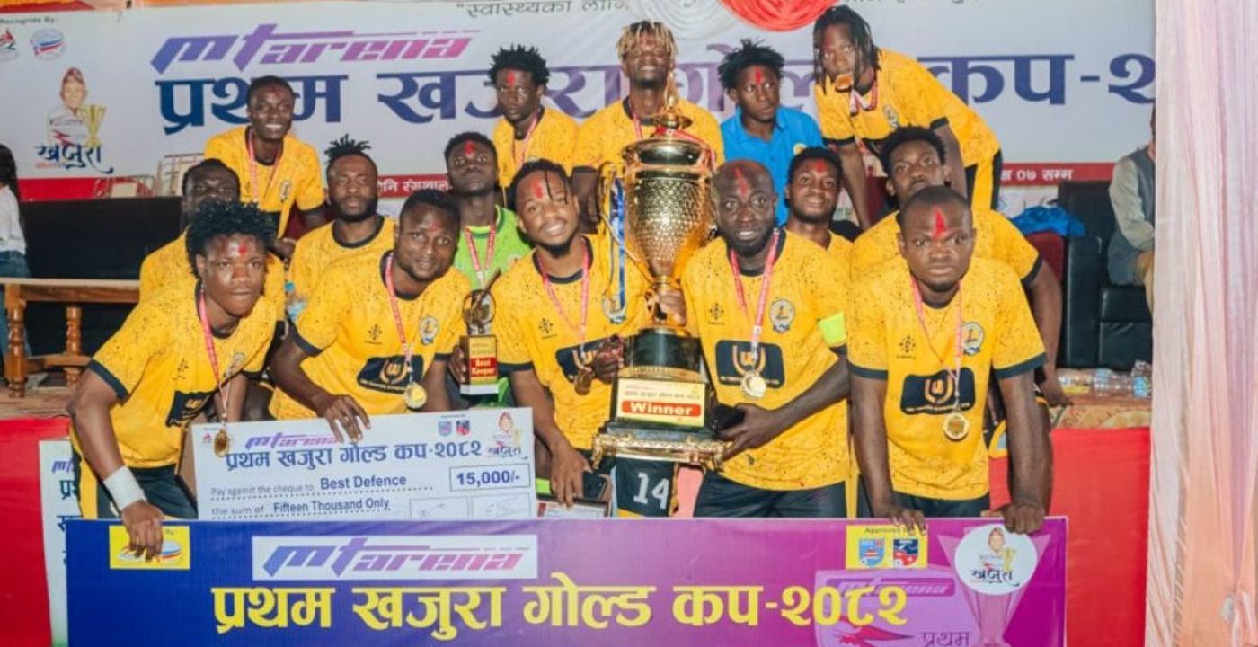 ६ वैशाख, नेपालगन्ज। खजुरा गाउँपालिका-४, डि गाउँस्थित मिनि रंगशालामा आइतबार आयोजित फाइनलमा नाइजेरियन टोली जष्ट जोनले भारतको जेविएम क्लब लखनउलाई ४-० गोल अन्तरले हराउँदै च्याम्पियनको उपाधि जित्यो। नाइजेरियाली जीतमा क्लब कोनले दुई गोल गर्दा एडवार्ड थोमस र ओलावी अफीजले प्रत्येकले एक-एक गोल गरे। उपाधिसँगै नाइजेरियन जष्ट जोनले चार लाख नगदसहित ट्रफी, मेडल र प्रमाणपत्र प्राप्त गरे भने उपविजेता जेविएमले पनि चार लाख नगदसहित पुरस्कार प्राप्त गर्यो।
