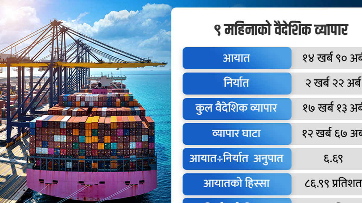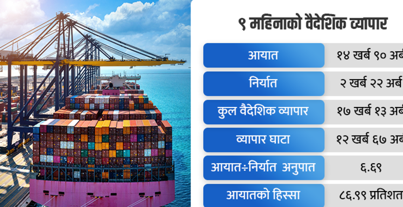 चालु आर्थिक वर्ष २०८२/८३ को तेस्रो त्रैमासिक अवधिमा नेपालले २ खर्ब रुपैयाँभन्दा बढी निर्यात गरेको छ, जुन विगत वर्षको तुलनामा १८.४६ प्रतिशतले वृद्धि हो। नेपालको नौ महिनाको कुल आयात १४ खर्ब ९० अर्ब रुपैयाँ पुगेको छ, जसमा पेट्रोलियम पदार्थ सबैभन्दा बढी २ खर्ब ५० अर्ब रुपैयाँ बराबर आयात गरिएको छ। वैदेशिक व्यापार घाटा १२ खर्ब ६७ अर्ब रुपैयाँ पुगेको छ भने आयात/निर्यात अनुपात ६.६९ रहेको छ। भारत र चीन मुख्य व्यापारिक साझेदार हुन्।