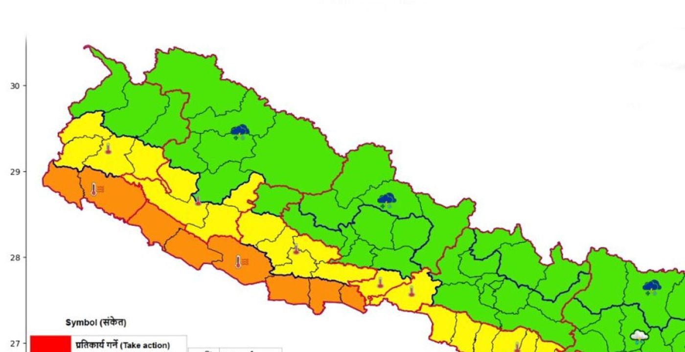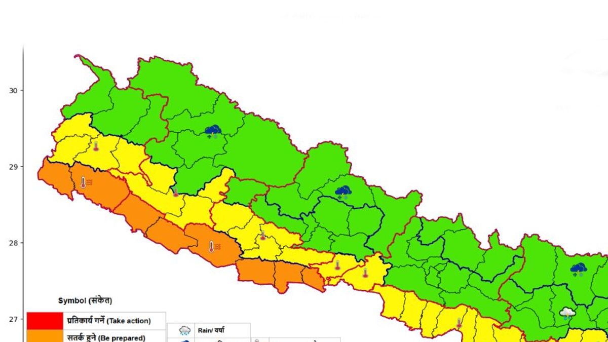 तराई क्षेत्रमा तातोको लहरको चेतावनी, अधिकतम तापक्रम ४० डिग्री सेल्सियससम्म पुग्ने अनुमान SPACE4K 2026-04-23 समाचार जल तथा मौसम विज्ञान विभागले आज दिउँसो तराईका पाँच शहरहरूमा अधिकतम तापक्रम ४० डिग्री सेल्सियससम्म पुग्न सक्छ भनी अनुमान गरेको छ। विशेष गरी भैरहवा र नेपालगञ्जमा अत्यधिक गर्मी हुने सम्भावना रहेको विभागले जनाएको छ। Latest Articles काठमाडौंको वायु प्रदूषण ‘धेरै अस्वस्थ’ स्तरमा पुगेको छ आजको तरकारी र फलफूलको मूल्य निर्धारण इरानमा अमेरिकी द्वन्द्वबीच जनजीवन कसरी बित्दैछ? मार्तडी-कोल्टी सडक कालोपत्रको काम अलपत्र, ठेकेदारको怠तिले बर्सेनि करोडौं रुपैयाँ फिर्ता स्पष्ट नीति र कार्यान्वयनको आवश्यकता