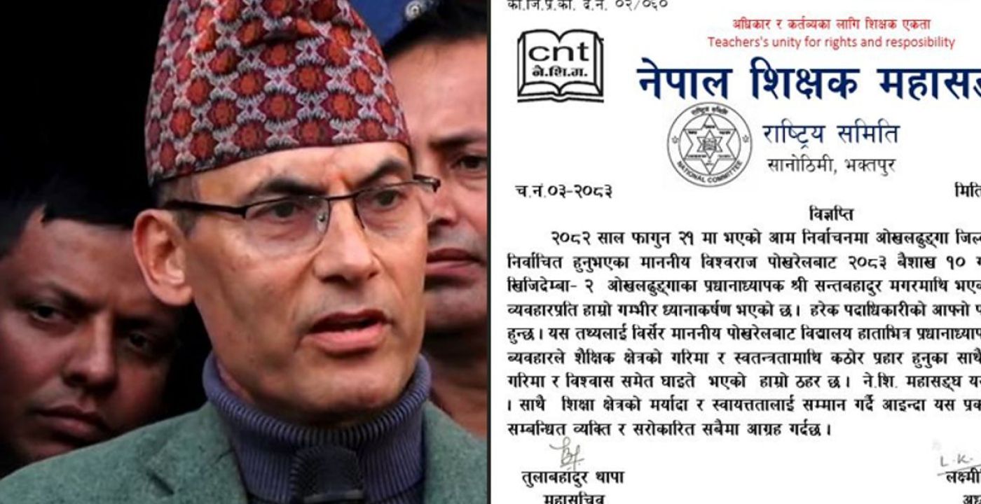 ‘माननीय विश्वराज पोखरेलले २०८३ वैशाख १० गते श्री चण्डेश्वरी मावि, सिजिदेम्बा–२, ओखलढुंगाका प्रधानाध्यापक सन्तबहादुर मगरमाथि देखाएको धम्कीपूर्ण र अपमानजनक व्यवहारप्रति हाम्रो ध्यानाकर्षण भएको छ,’ विज्ञप्तिमा भनिएको छ, ‘हरेक पदाधिकारीको आफ्नो पदीय जिम्मेवारी र क्षेत्राधिकार हुन्छ । यस्ता कुरा बिर्सिएर माननीय पोखरेलले विद्यालयभित्र प्रधानाध्यापकमाथि गरेको अशोभनीय व्यवहारले शैक्षिक क्षेत्रको गरिमा र स्वतन्त्रतामाथि गम्भीर चोट पुर्‍याएको छ भने जननिर्वाचित प्रतिनिधिको गरिमा र विश्वाससमेत ह्रास भएको हाम्रो ठहर छ ।’