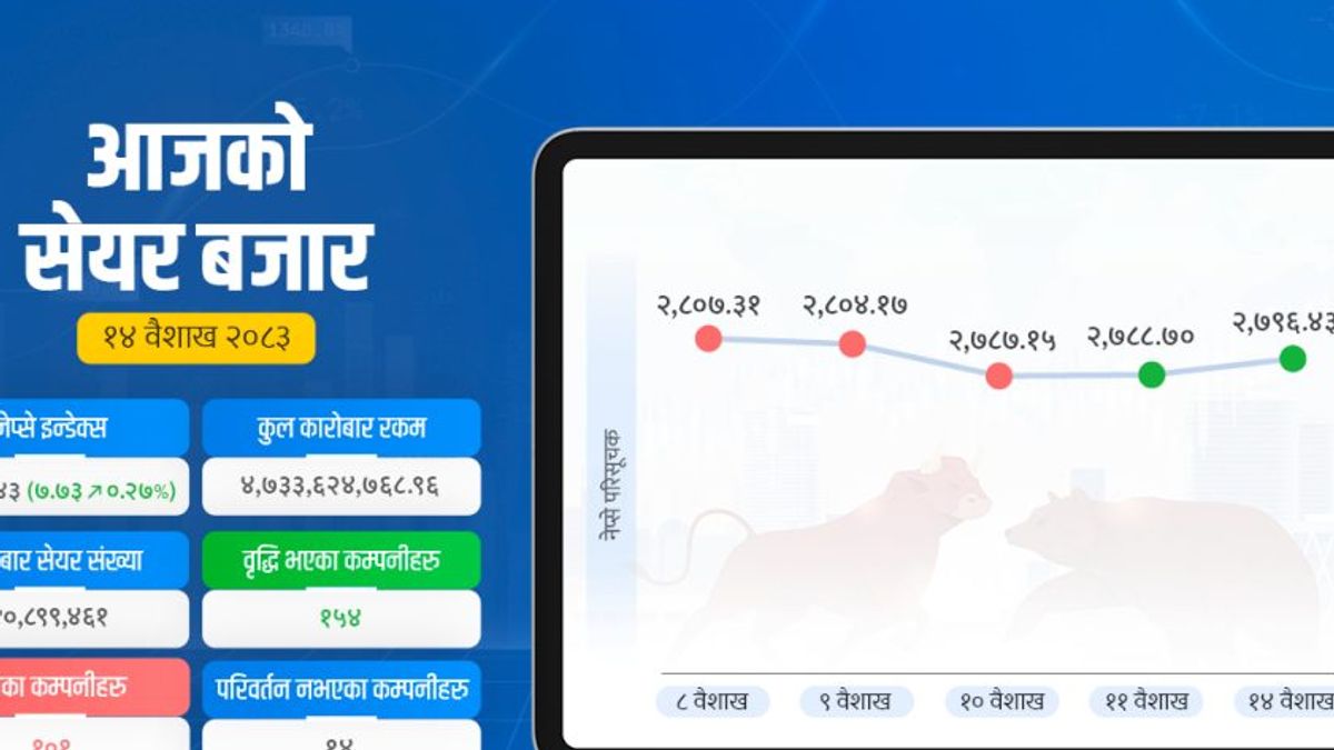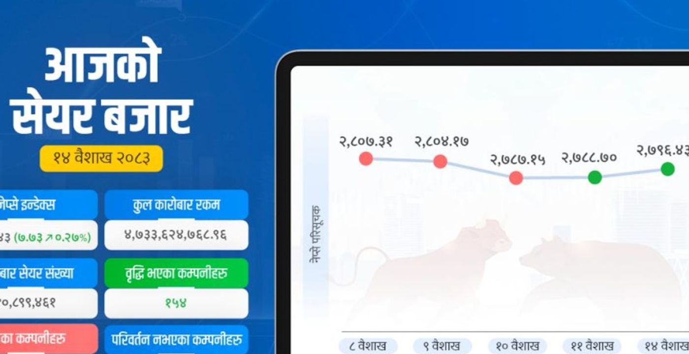 सेयर बजारको नेप्से परिसूचक साताको पहिलो कारोबार दिन ७.७३ अंकले वृद्धि भई २७९६ अंकमा पुगेको छ। कारोबार रकम घटेर ४ अर्ब ७४ करोड रुपैयाँमा सीमित भएको छ भने १५७ कम्पनीको सेयर मूल्य वृद्धि भएको छ। पाल्पा सिमेन्ट, कर्पोरेट डेभलपमेन्ट बैंक, शिखर पावर र सिटी होटलको सेयर मूल्य १५ प्रतिशतले वृद्घि भएको छ। १४ वैशाख, काठमाडौं।