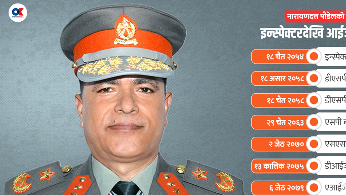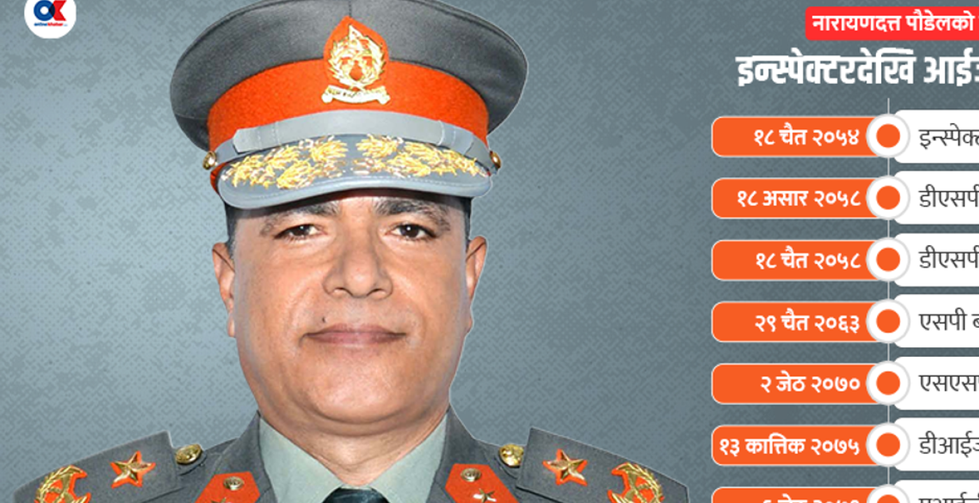 मन्त्रिपरिषद्ले नारायणदत्त पौडेललाई सशस्त्र प्रहरी बलका १३औं प्रमुखसचिव (आईजीपी) को रूपमा नियुक्त गर्ने निर्णय गरेको छ। पौडेलले १८ वैशाख २०८३ देखि आईजीपीको जिम्मेवारी ग्रहण गर्नेछन्। उनले नेपाल प्रहरी र सशस्त्र प्रहरीमा २८ वर्ष सेवा गरेका छन्। १४ वैशाख, काठमाडौं। सशस्त्र प्रहरी बल, नेपालका १३औं आईजीपीमा नारायणदत्त पौडेल नियुक्त भएका छन्। सोमबार आयोजित मन्त्रिपरिषद् बैठकले अतिरिक्त महानिरीक्षक (एआईजी) पौडेललाई आईजीपी बनाउन स्वीकृति दिएको हो। सरकारका प्रवक्ता तथा शिक्षा मन्त्री सस्मित पोखरेलले पनि पौडेललाई आईजीपी पदमा बढुवा गर्ने निर्णय भएको जानकारी दिए। उनका अनुसार पौडेल १८ वैशाखपछि कमान्ड सम्हाल्नेछन्। हाल उनी सशस्त्र प्रहरी प्रधान कार्यालय हल्चोकस्थित मानव स्रोत विभागको प्रमुख पदमा कार्यरत छन्। वर्तमान आईजीपी राजु अर्यालले चार वर्षे कार्यकाल पूरा गरी यही १८ वैशाखमा अवकाश लिने भएका छन्। उनको अवकाशपछि सरकारले पौडेललाई आईजीपी बनाउने निर्णय गरेको हो। पौडेल आईजीपी बढुवाको प्रमुख दाबेदार थिए। उनी १८ चैत २०५४ मा नेपाल प्रहरीको इन्स्पेक्टरको रूपमा सेवारत भएका थिए। आईजीपीको पदका अन्य दाबेदारमा सीमा विभागका एआईजी वंशी दाहाल र कार्य विभागका एआईजी गणेश ठाडा मगर पनि थिए भने ती दुवै पौडेलभन्दा भन्दा जूनियर थिए। पौडेल ६ जेठ २०७९ मा एआईजीमा बढुवा भएका थिए। राजु अर्याल आईजीपी बनेपछि एआईजी पदमा उनी बढुवा भएका हुन्। दोस्रो दाबेदार दाहाल उनलाई करिब पाँच महिना पछि एआईजीमा बढुवा भएका थिए। दाहाललाई सरकारले २८ असोज २०७९ मा एआईजी बढुवा गरेको थियो र सीमा सुरक्षा विभागमा एक एआईजी दरबन्दी पनि थपिएको थियो। ठाडा मगर उनलाई भन्दा करिब दुई वर्ष जूनियर हुन् र उनी २ असार २०८२ मा मात्र एआईजीमा बढुवा भएका थिए। उनी पनि भर्ना प्रक्रियामा दुई वर्ष जूनियर थिए र २०५६ मा प्रहरी निरीक्षकको रूपमा भर्ती भएका थिए। पौडेल १८ चैत २०८४ सम्म दुई वर्ष आईजीपी पदमा रह्नेछन्। वर्तमान सशस्त्र प्रहरी नियम अनुसार ३० वर्षे सेवा हद पुरा भएपछि उनी १८ चैत २०८४ मा अवकाश हुने छन्। पौडेल खरिदारको रूपमा सुरुवात गरी आईजीपीसम्म पुगेका छन्। सुर्खेतको पुरानो जर्बुटा गाविस-५ मा जन्मिएका उनले सुर्खेतबाट एसएलसी उत्तीर्ण गरी खरिदारको परीक्षा पास गरे। पछि नगरपालिकामा स्थायी नियुक्ति लिएर काम गरे। उनले भने, ‘लोकसेवा पास गरी खरिदार भएको थिएँ र पाँच वर्ष वीरेन्द्रनगर नगरपालिका मा काम गरें। प्रहरीमा आउने सोच भने कहिल्यै थिएन।’ उनले माओवादीसँग पटक–पटक आमनेसामने हुन पुगेका थिए। ‘त्यतिबेला साथीहरू गोली लागेर घाइते भए, तर म संयोगले बचें,’ पौडेल सम्झिन्छन्।