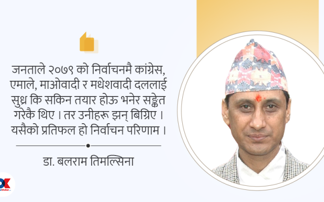 प्रतिनिधिसभा सदस्य निर्वाचन सम्पन्न भई परिणाम समेत आइसकेको छ । निर्वाचन परिणामले नेपाली कांग्रेस, नेकपा एमाले, नेपाली कम्युनिस्ट पार्टी र मधेशवादी दललाई मूर्छित बनाएको छ । झन्डै दुई तिहाइ बहुमत…